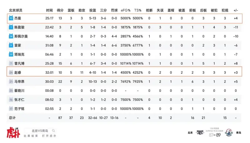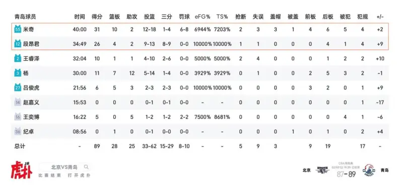 • 北京87-89青岛:青岛段昂君8记三分26分4板2助,米奇31分10板2助末节连得8分;北京杰曼13分3板3助,赵睿10分5板11助,关键两罚不进,青岛完成11-0逆转;
