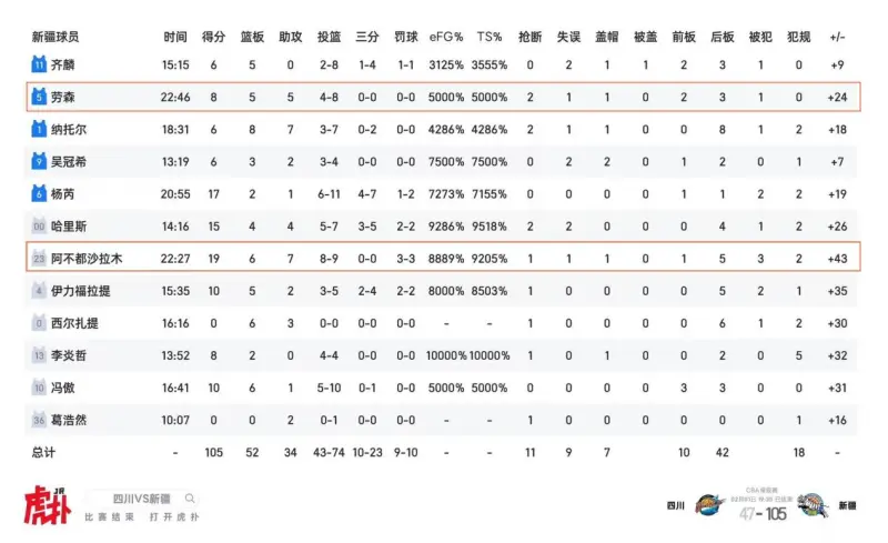 • 四川47-105新疆:四川段睿骐2分1板1助,景菡一14分2板2助;新疆劳森8分5板5助,阿不都19分6板7助,新疆首节仅让四川得6分,半场53-18,全场净胜58分;