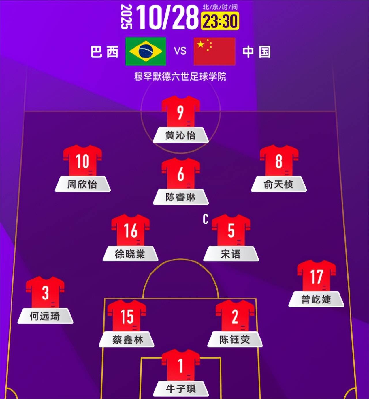 中国女足首发:周欣怡、宋语、牛子琪、蔡鑫林、徐晓棠、黄沁怡、曾屹婕、陈睿琳、陈钰荧、俞天桢、何远琦