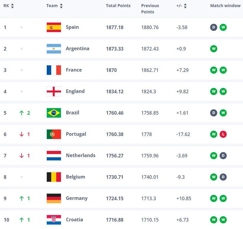 自从世界排名上次更新以来,全球共进行了149场男足国际比赛(包括友谊赛)。前四名的位置没有任何变化,依旧是西班牙队、阿根廷队、法国队和英格兰队。