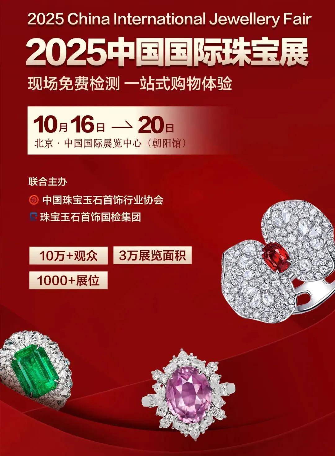 2025中国国际珠宝展将于10月16—20日在北京中国国际展览中心(朝阳馆)举办,展览面积30,000平方米,预计吸引超1,200家国内外企业参展。展会涵盖品牌、翡翠、珍珠、彩宝、钻石K金、水晶矿物、国际、玉雕、GAC设计师、非洲翠(石英质玉)、直播、知识产权(IP)文化资源及科技创新等十余个特色展区,集中呈现全球珠宝产业链的前沿设计、工艺与市场趋势。期间将举办新品发布、赛事颁奖、商贸对接等配套活动,并由珠宝国检集团提供现场免费检测服务。