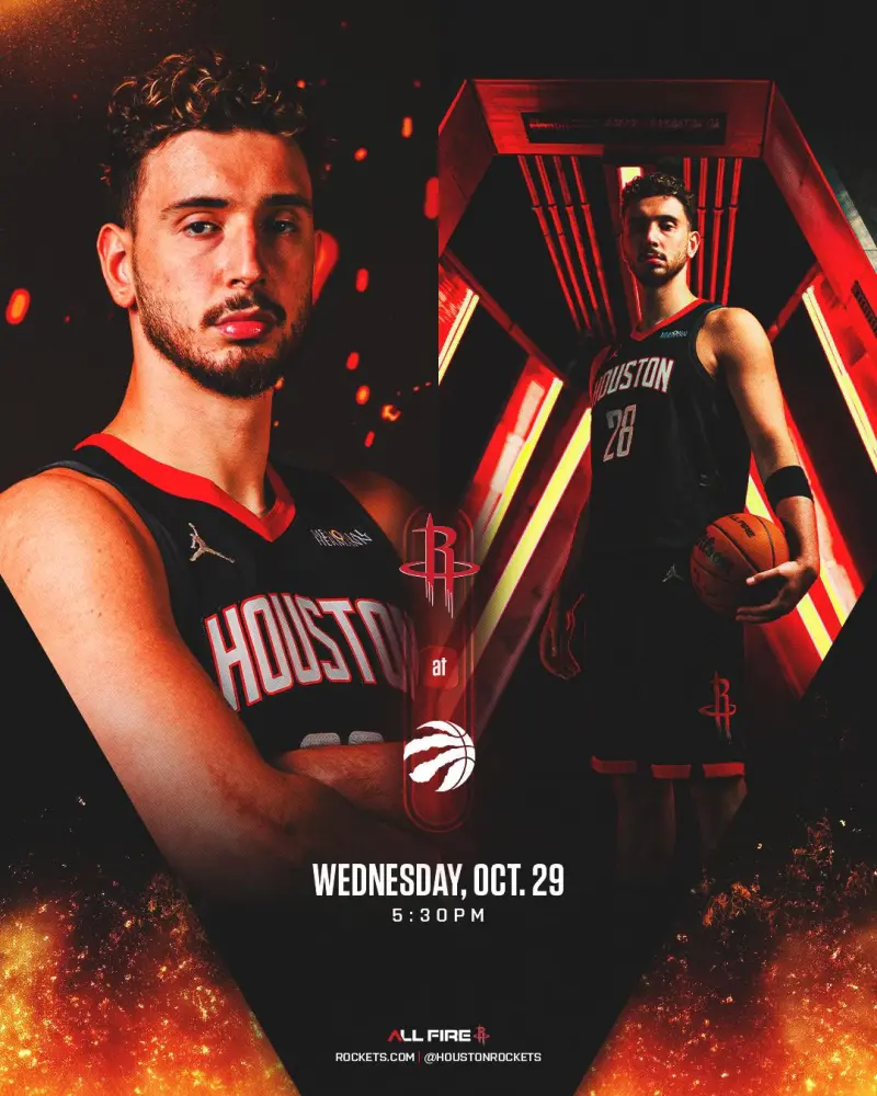虎扑10月29日讯 今日,火箭社媒晒出明日常规赛客场对阵猛龙的赛事预告海报,阿尔佩伦-申京出镜。