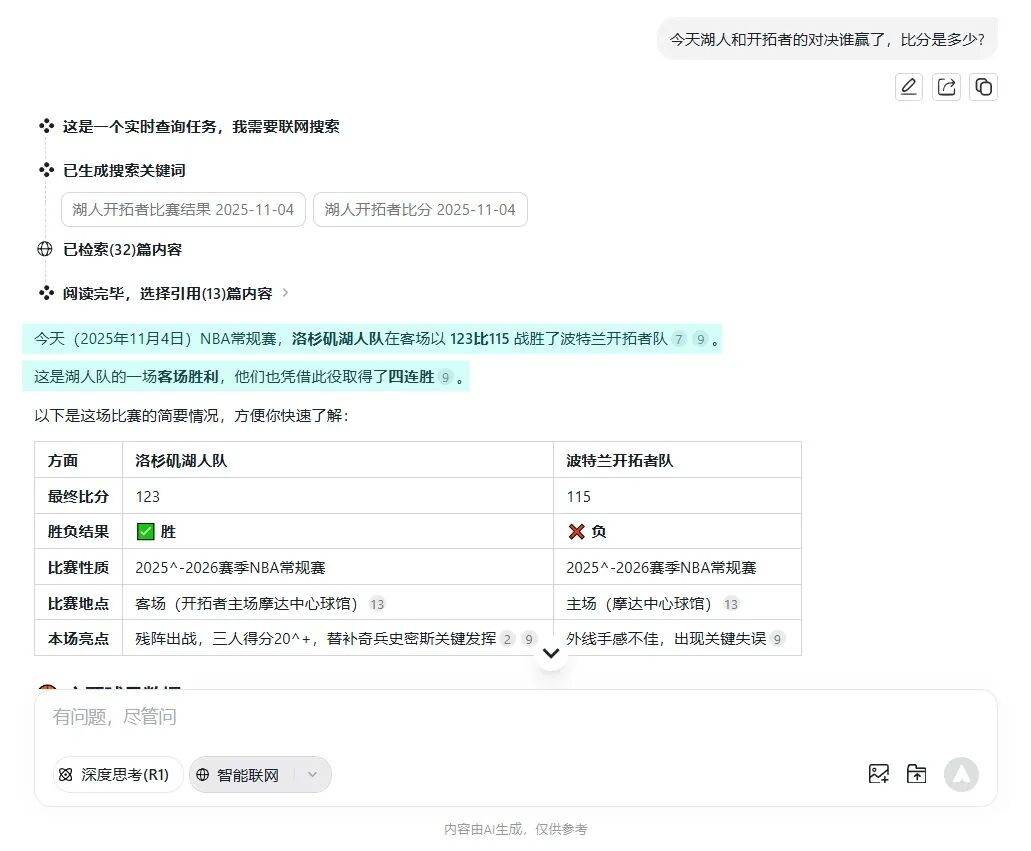 今天上午就有小伙伴问我:“湖人和开拓者谁赢了?”,让我带你们体验 BajoSeek 如何用其独有的“智能联网” 和 ”MCP调用“功能,将你的查询体验升级到极致!秒速获取最新战报!现在就来和大家分享这场精彩对决!