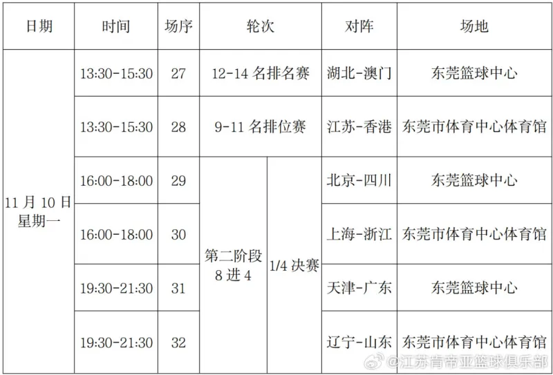 江苏男篮社媒发布赛事预告:明日13:30,江苏队将在东莞市体育中心体育馆迎战中国香港队,两队将进行9-11名的排位赛。