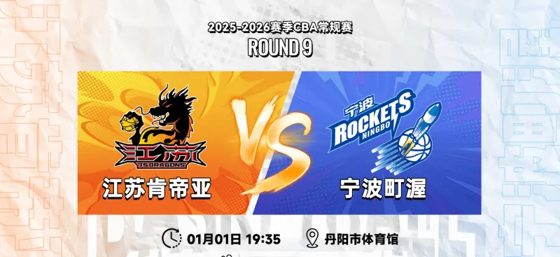江苏男篮社媒分享赛事预告:常规赛ROUND9,2026年1月1日(周四)19:35,将对阵宁波男篮。
