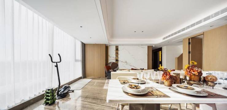 上叠约6.75m南向全景宽厅,将餐、厨、客、阳台无缝串联,形成开阔流畅的整体空间。巨幅玻璃幕墙引光入室,全天候光影变幻成为家中流动的艺术。南北通透的设计,不仅延展了视觉尺度,更将天际线定格为窗景,满足对空间尺度与视觉震撼的双重追求。